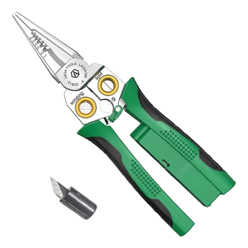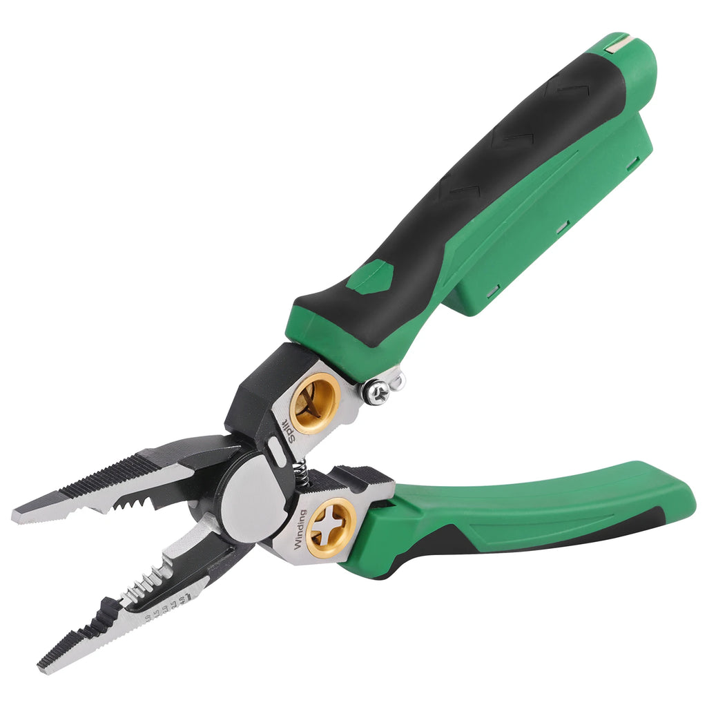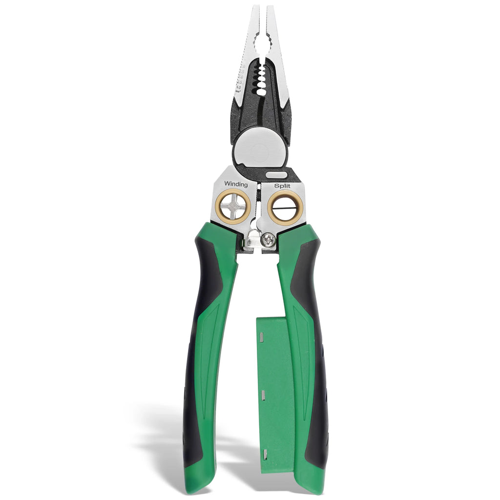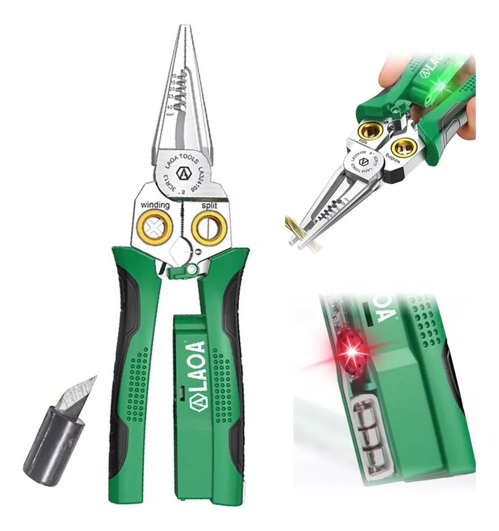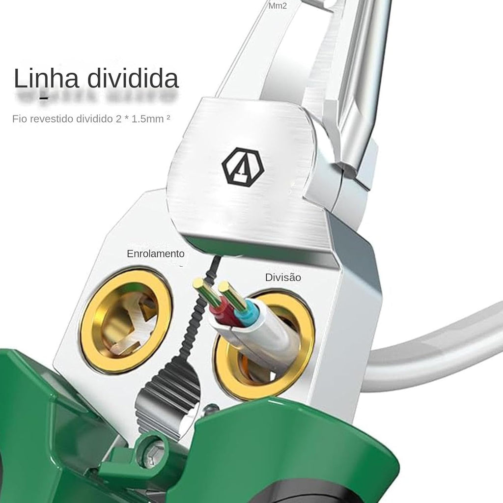 Cada parte do alicate oferece uma função específica: ajuste preciso, desencapador de fios, cortador de fios, puxador de fios, divisor de fios, enrolador de fios e detector de energia. Uma ferramenta versátil e eficiente para seu trabalho.